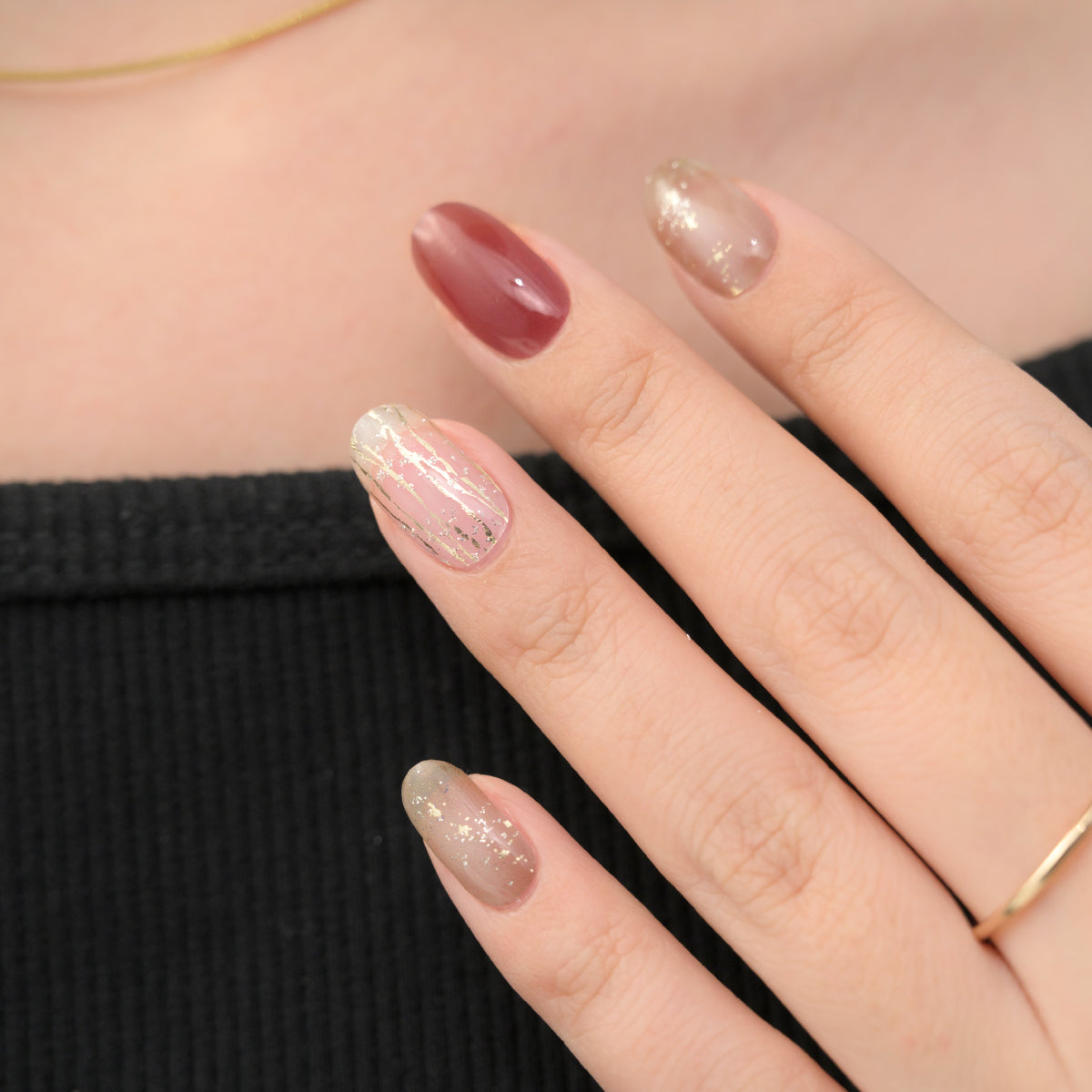 大人な印象のボルドーに、ブラウンのニュアンスと箔デザインがアクセント。